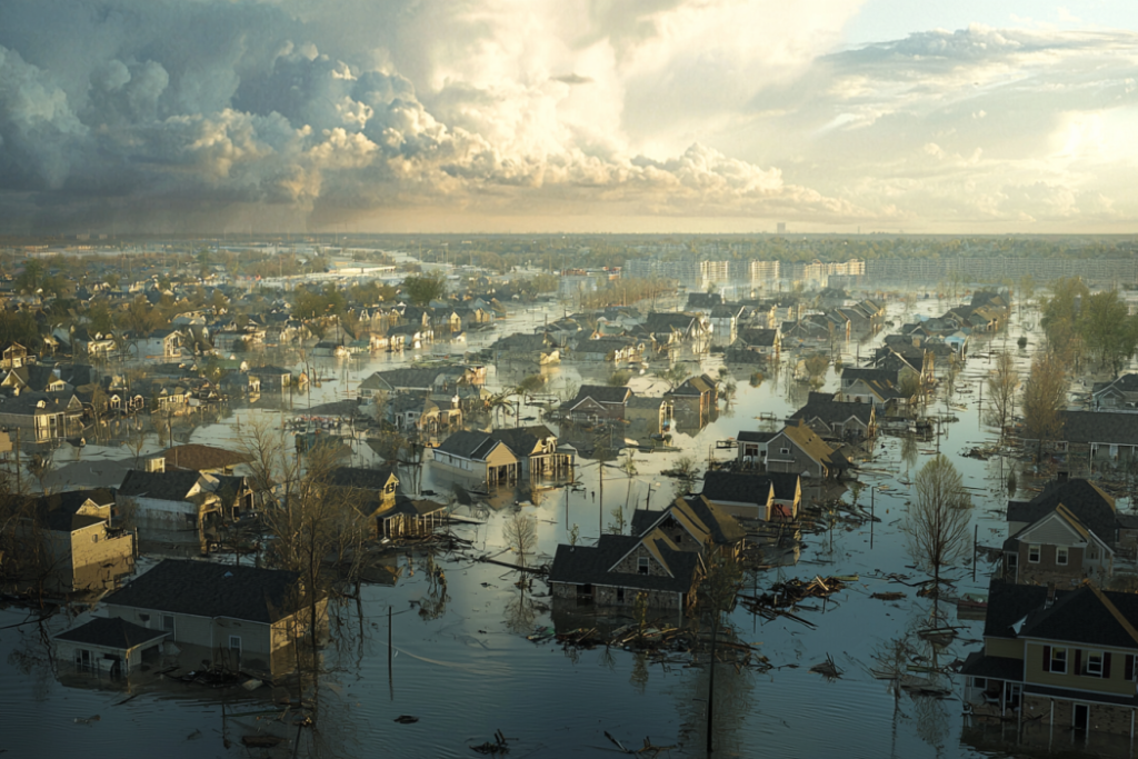 Create an image depicting a flooded neighborhood with damaged homes, juxtaposed with new construction plots offered by the government in a safer area. The scene should convey a sense of transition and relief amidst devastation, emphasizing the government’s initiative to relocate residents and rebuild lives away from flood zones.